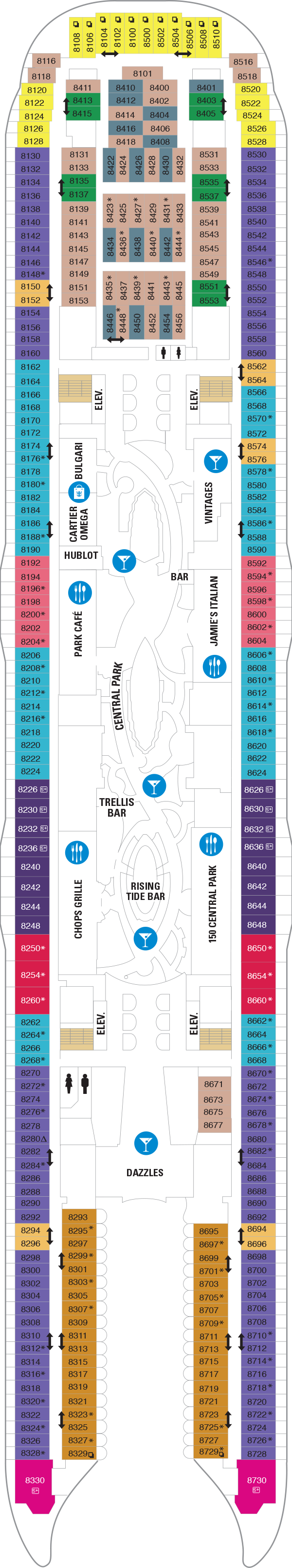 Hier finden Sie Deckpläne, Schwerpunkte und Ausstattungsmerkmale der einzelnen Decks – perfekt, um Kabinen, Restaurants und Freizeitbereiche der Harmony of the Seas zu vergleichen.